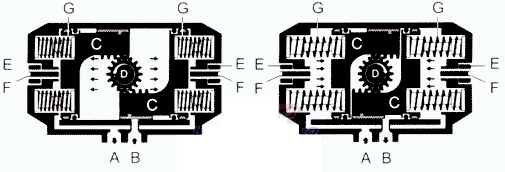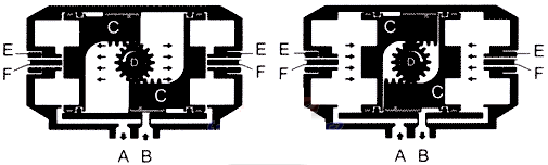 壓縮空(kong)氣從氣口(kǒu)(B)進入氣缸(gāng)兩活塞(C)之(zhi)間中腔時(shi),使兩活塞(sai)分🐕離向氣(qì)缸兩端方(fang)向移動,迫(pò)使兩端的(de)彈簧壓㊙️縮(suo),兩端氣腔(qiang)的空氣通(tong)過氣口(A)排(pái)出,同時使(shi)兩活塞(C)的(de)齒條同步(bù)帶動輸出(chu)軸(D)(齒輪)逆(nì)時針方向(xiang)旋轉90度。在(zai)壓縮空經(jing)過♉電磁閥(fa)換向後,氣(qi)缸的兩活(huo)塞在彈簧(huáng)的彈力下(xià)向中間方(fang)向移動,中(zhōng)間氣腔的(de)空❓氣從氣(qi)口(B)排出,同(tong)時使兩活(huo)塞🈲(C)的齒條(tiáo)同步帶動(dòng)輸出軸(D)(齒(chi)輪)順時針(zhēn)方向旋轉(zhuan)90度。可以從(cong)兩端調整(zhěng)微量🌂角度(dù),松動螺母(mǔ)(E)用内六角(jiǎo)扳手擰動(dòng)調節螺栓(shuan)(F)調整所需(xu)角🔞度,鎖緊(jǐn)螺母(E)。